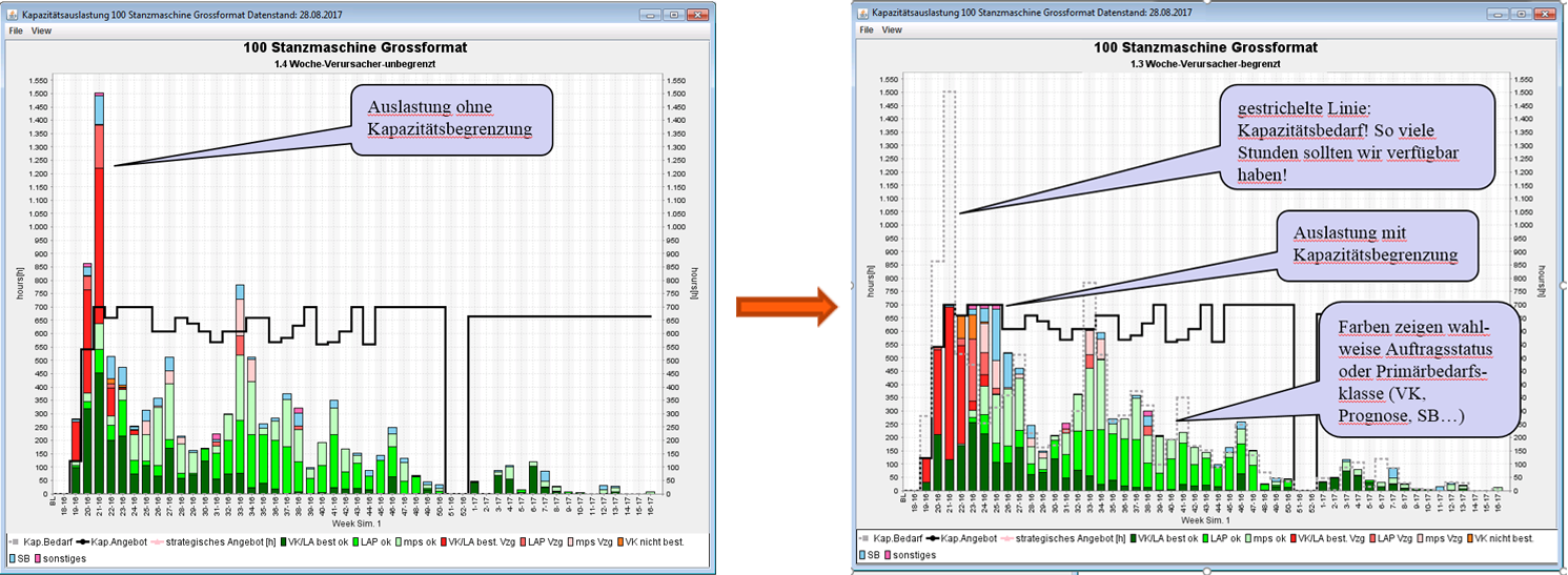 e.g. a light blue bar in the chart denotes stock orders without a current demand, which are then moved to a later date in the event of a bottleneck.