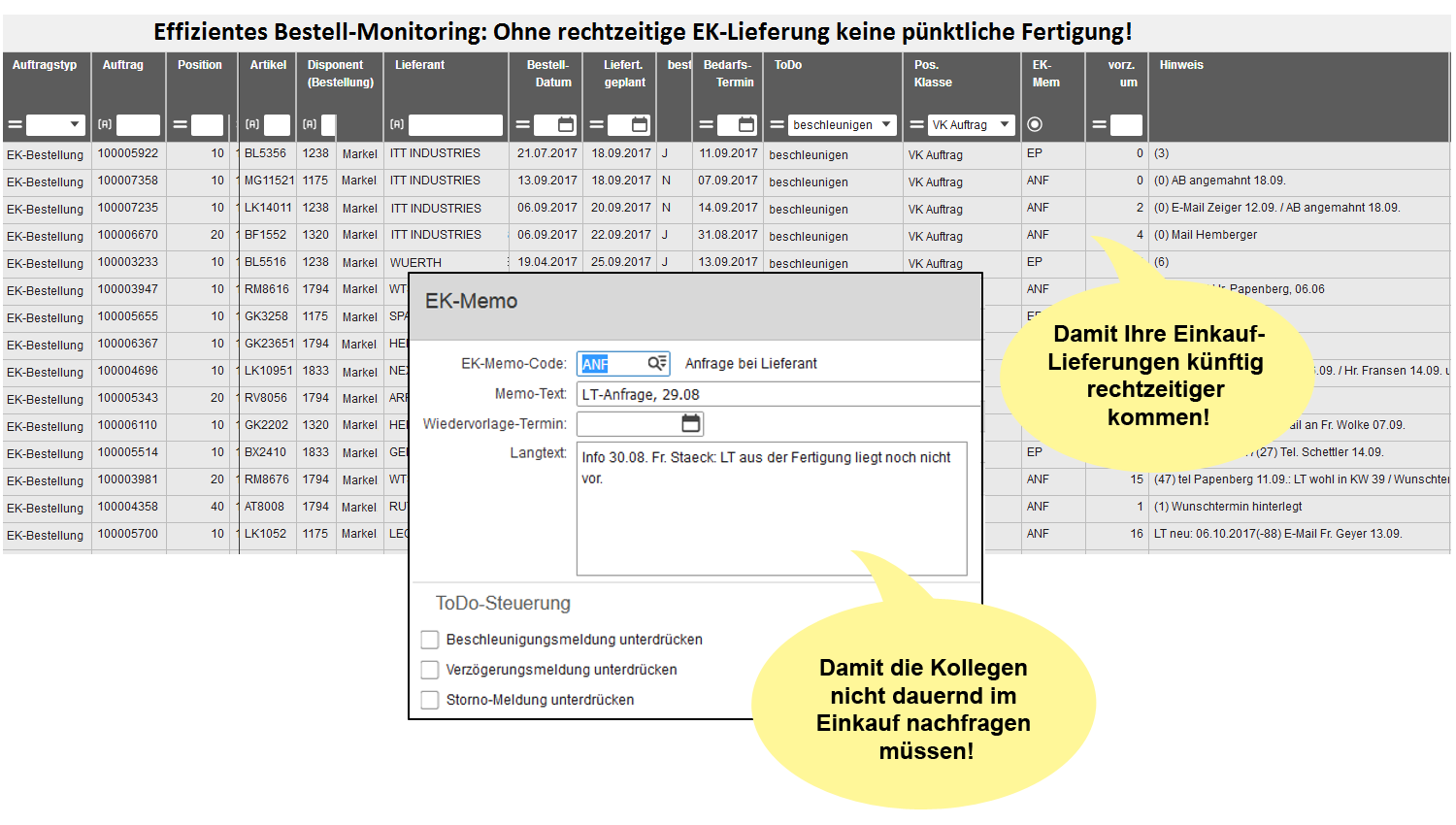“Show me all my order items, which I should bring forward by at least 4 days because of sales requirements and which I have not yet processed.” This is the filter which then selects the correct and important items from the wealth of data. There will be no more acceleration-message-tsunamies! Thus colleagues don`t constantly have to lodge an enquiry in the purchasing department!