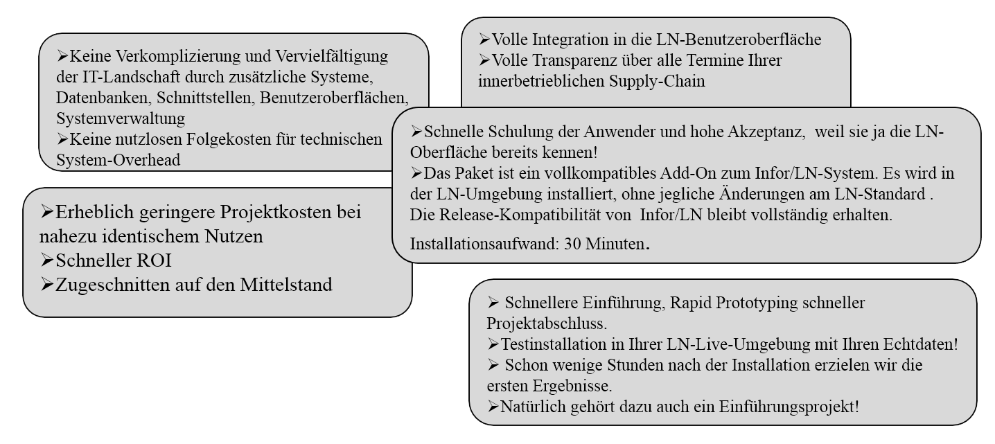 In contrast to “docked-on third party software” such as the dedicated control centre, external APS or MES systems, the ascon-planner allows a continous resource planning from the sales and distribution to the assembly and purchasing providing the operator with a completely transparent overview of the schedule and status of every item. All this happens within the LN environment for all end-users.